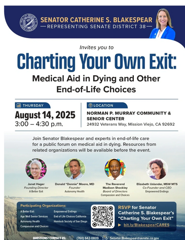 People attended, both in-person and virtually, the second end-of-life panel discussion held on August 14th, 2025. It was a successful event delivering on our goal to further Medical Aid in Dying education for Californians! Much thanks to Norman P. Murray Community & Senior Center for hosting us‚ Senator Catherine Blakespear for organizi